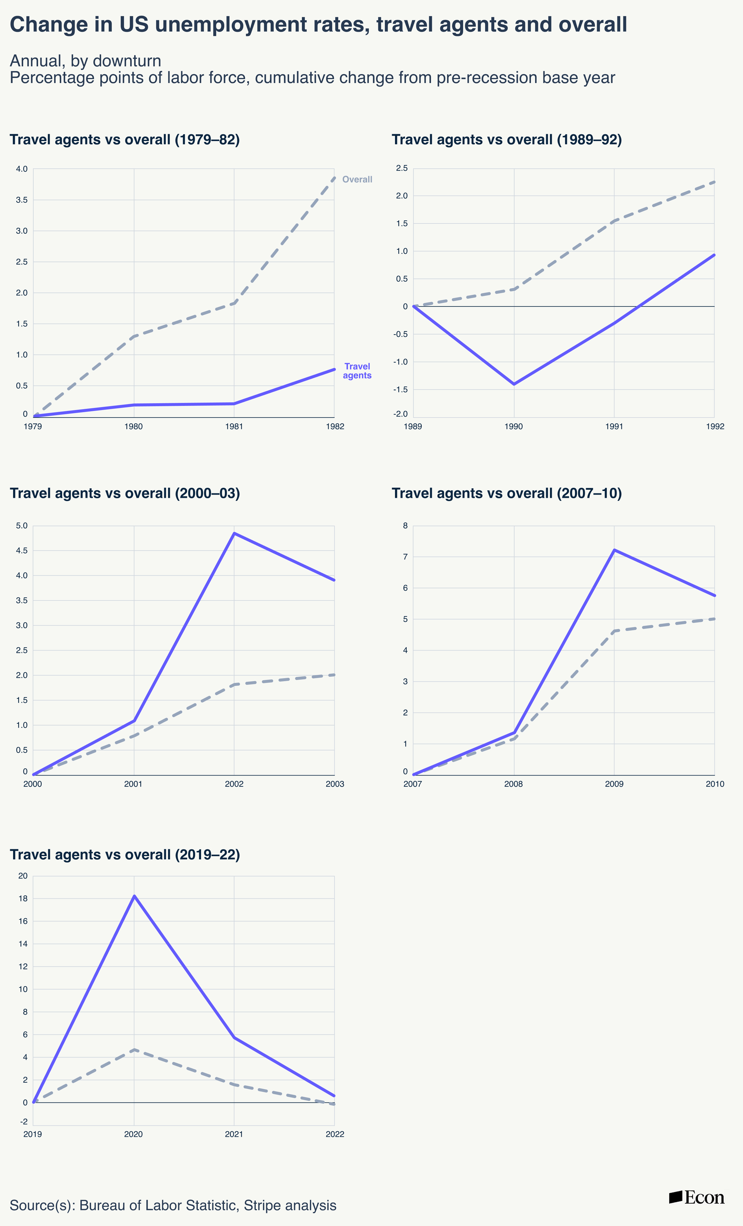 1. Travel agent layoffs came in recessionary bursts, not a gradual decline.