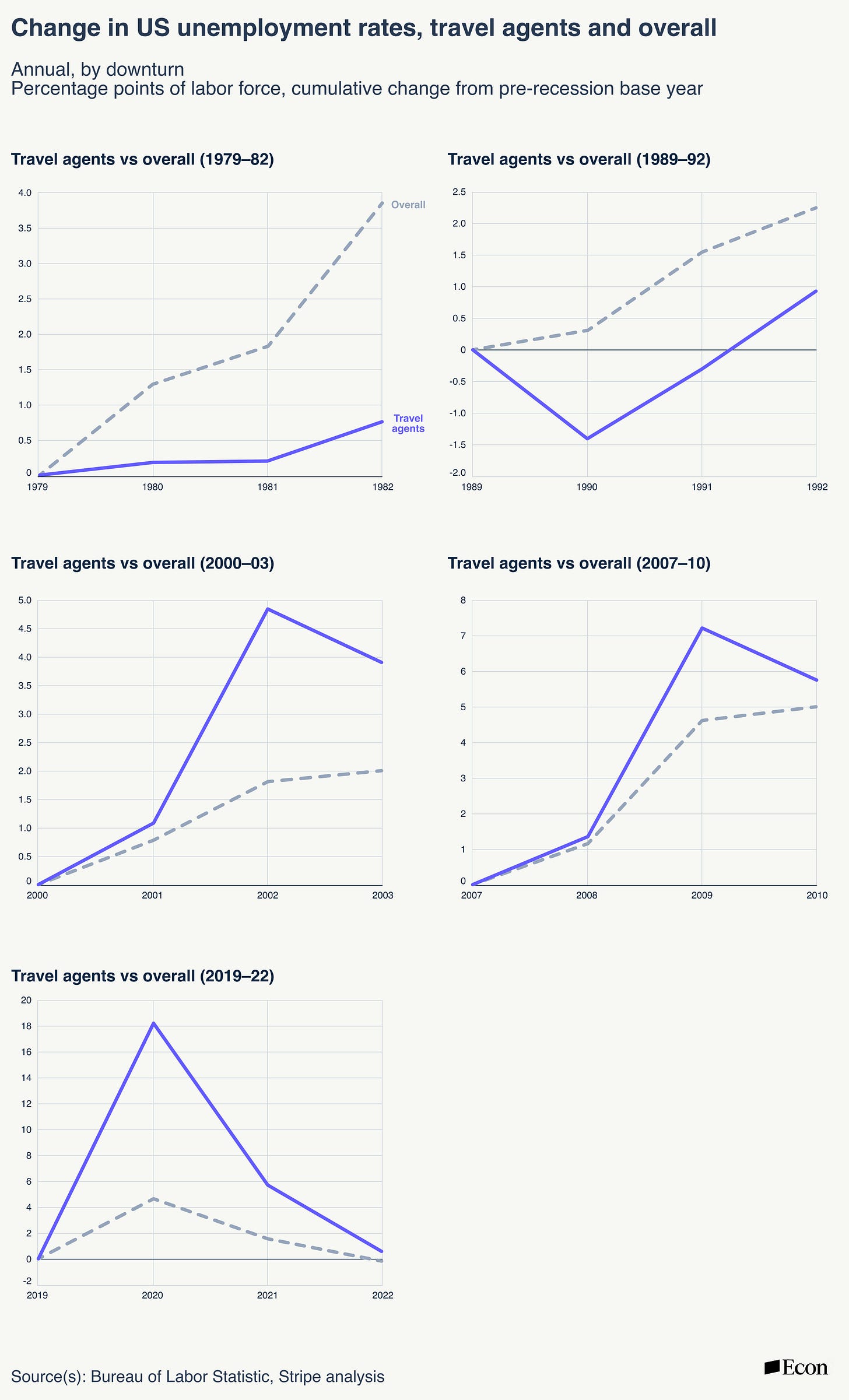 But this low rate comes with a major asterisk. Travel agent unemployment has become far more sensitive to economic downturns. Before 2000, travel agent unemployment rates typically rose by less than the overall rate during downturns. Between 1979 and 1982, for example, the travel agent unemployment rate rose only 0.8 percentage points despite the overall rate jumping nearly 4 percentage points. The pattern repeated over 1989–1992, with travel agent unemployment rising only 0.9 percentage points versus 2.2 overall. But after 2000 the pattern flipped: the travel agent jobless rate spiked 3.9 percentage points over 2000–2003 versus 2 overall, 5.8 versus 5 over 2007–2010, and 0.7 versus 0 over 2019–2022.2